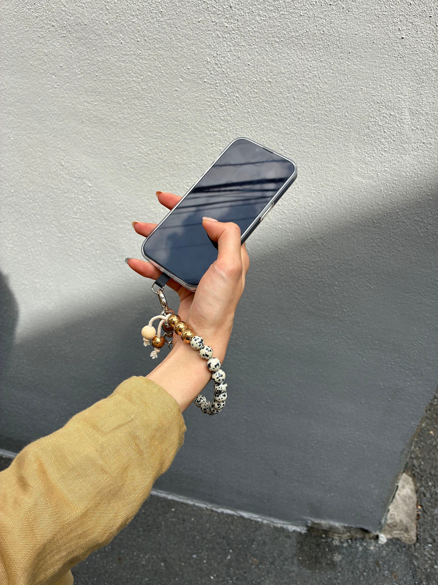 スマホの落下防止としての機能を果たしつつ、ブレスレット感覚で気軽に装着できるのが魅力。ポーチのストラップとしても活用でき、日常使いはもちろん、特別なシーンでもおしゃれに演出します。