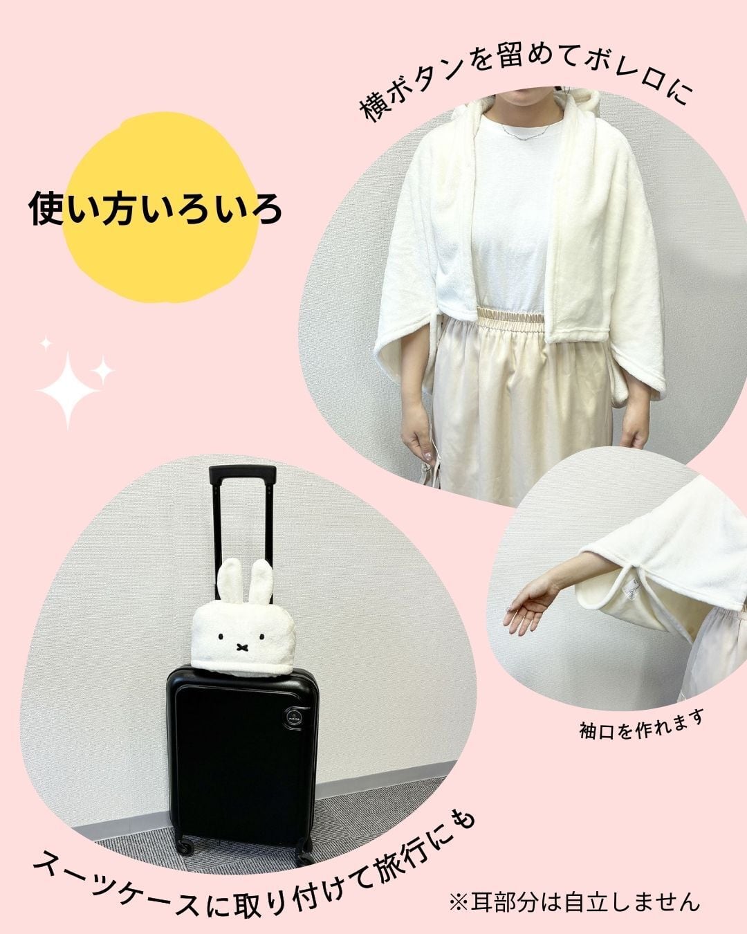 長時間のドライブでも心地よさを提供する「ブランケットになる!ミッフィーヘッドレストクッション」。ヘッドレストクッションも使え、尚且つ、簡単にブランケットにも変身します。面ファスナーを活用すれば、着脱もスムーズ。スーツケースに取り付けることもできるので、旅行やお出かけにも便利です。